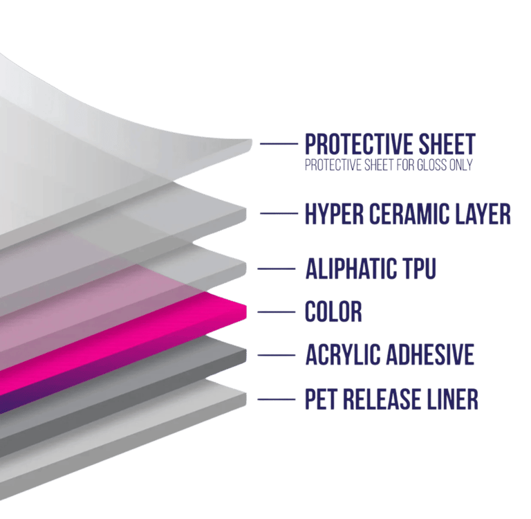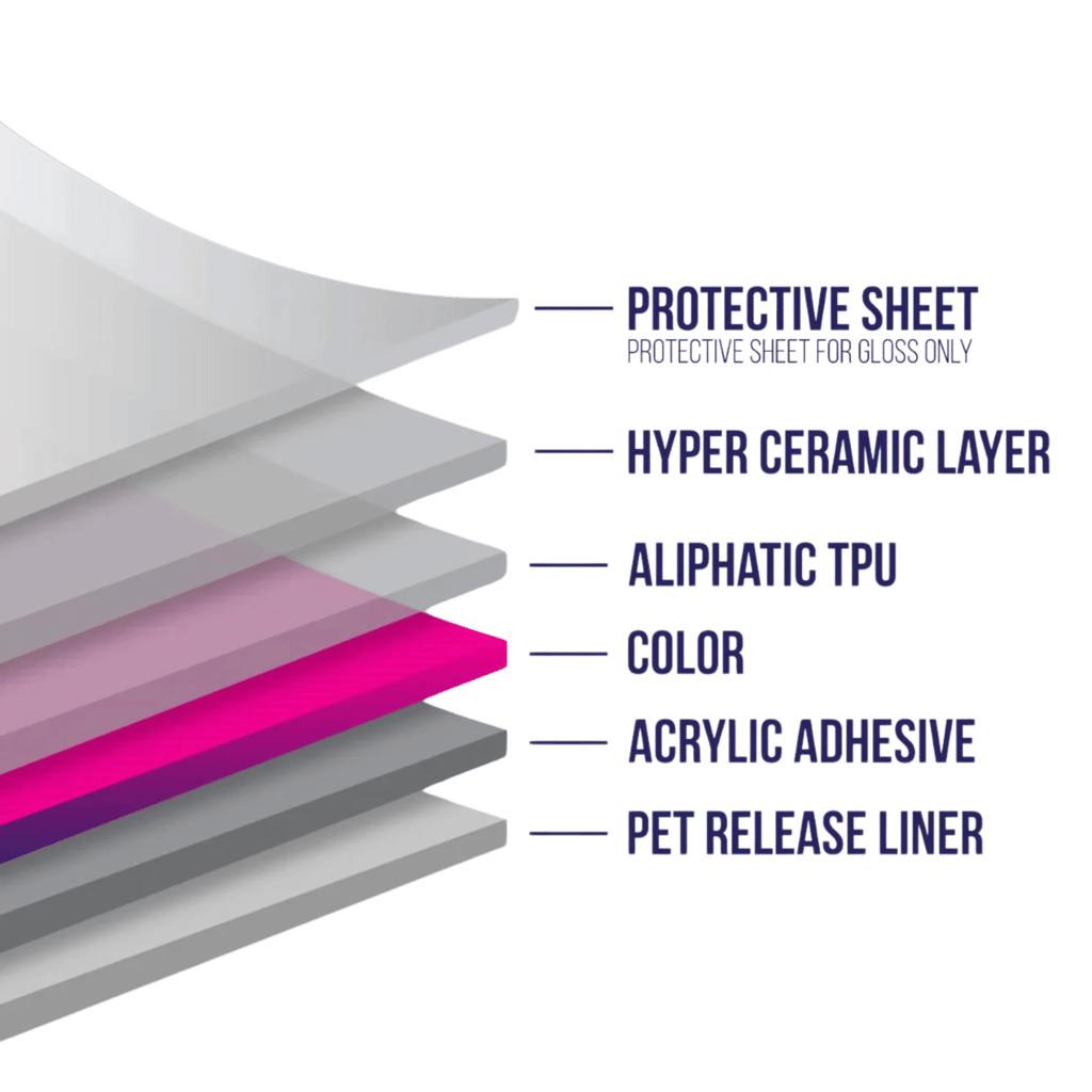 Colored PPF is composed of 5 uniquely constructed layers that create the industry’s latest dry-installation PPF. The individual layers allow for rich color and deep finishes that are easily mistaken for paint. Thanks to the self-healing heat properties of our Hyper Ceramic Top Coating, you no longer have to worry about small scratches and imperfections.
